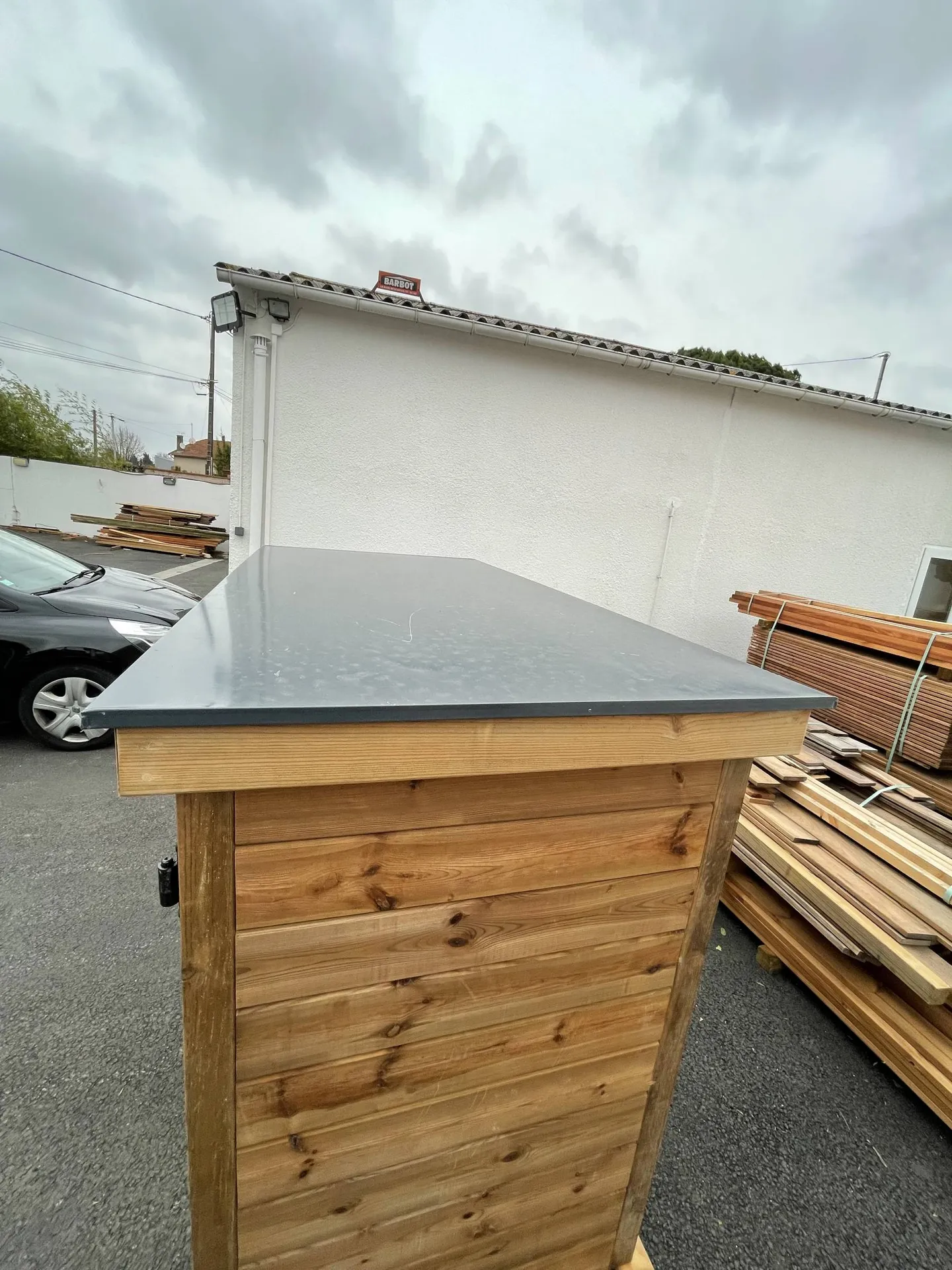 Nous avons conçu ce local Piscine extérieur de façon à ce qu'il soit étanche pour ne pas avoir d'infiltration d'eau à l'intérieur. On a donc rajouté une taule en alu gris anthracite sur le dessus du local extérieur qui en plus de faire l'étanchéité de l'ouvrage donne un coté esthétique au local.