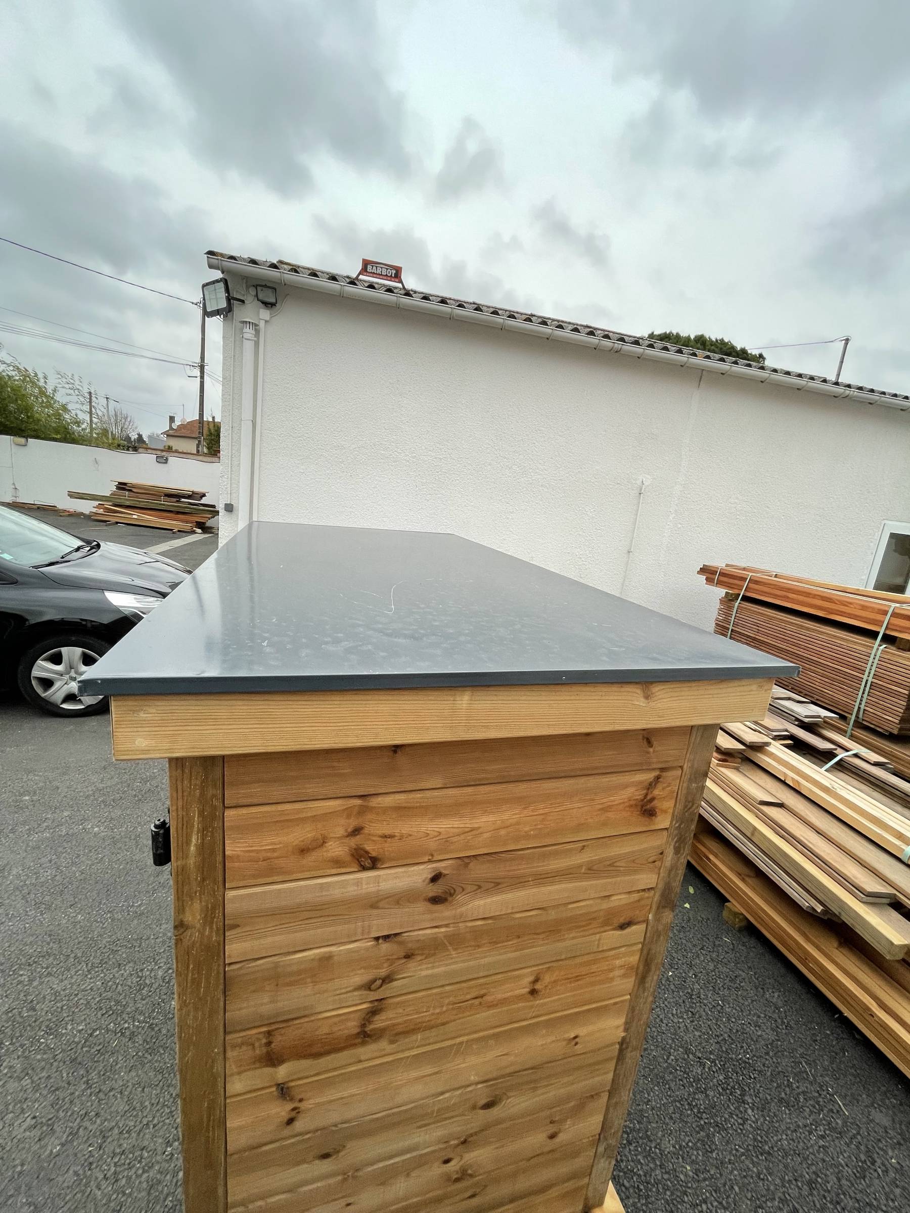 Nous avons conçu ce local Piscine extérieur de façon à ce qu'il soit étanche pour ne pas avoir d'infiltration d'eau à l'intérieur. On a donc rajouté une taule en alu gris anthracite sur le dessus du local extérieur qui en plus de faire l'étanchéité de l'ouvrage donne un coté esthétique au local.