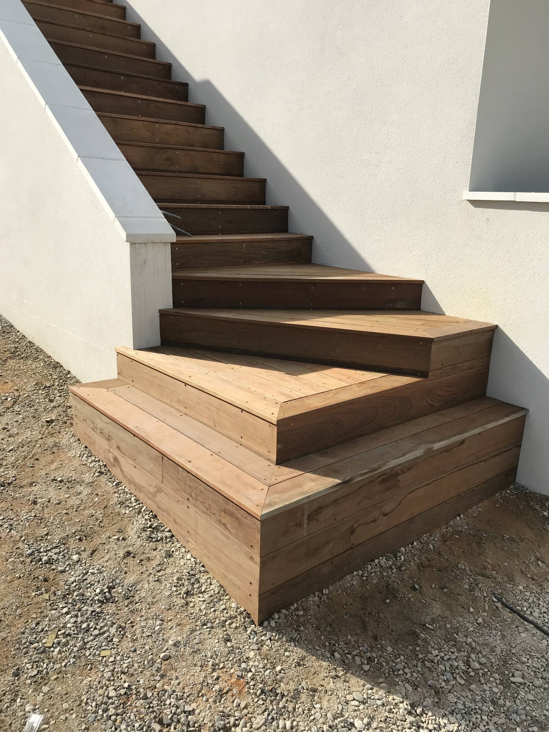 Pour cela, nous avons relevé précisément les dimensions de chaque marche pour adapter la coupe du bois à chaque contremarche et marche. Après la pose des marches en lames de bois IPE, nous avons découpé et ajusté des nez de marche pour assurer une finition propre, sans débord dangereux.