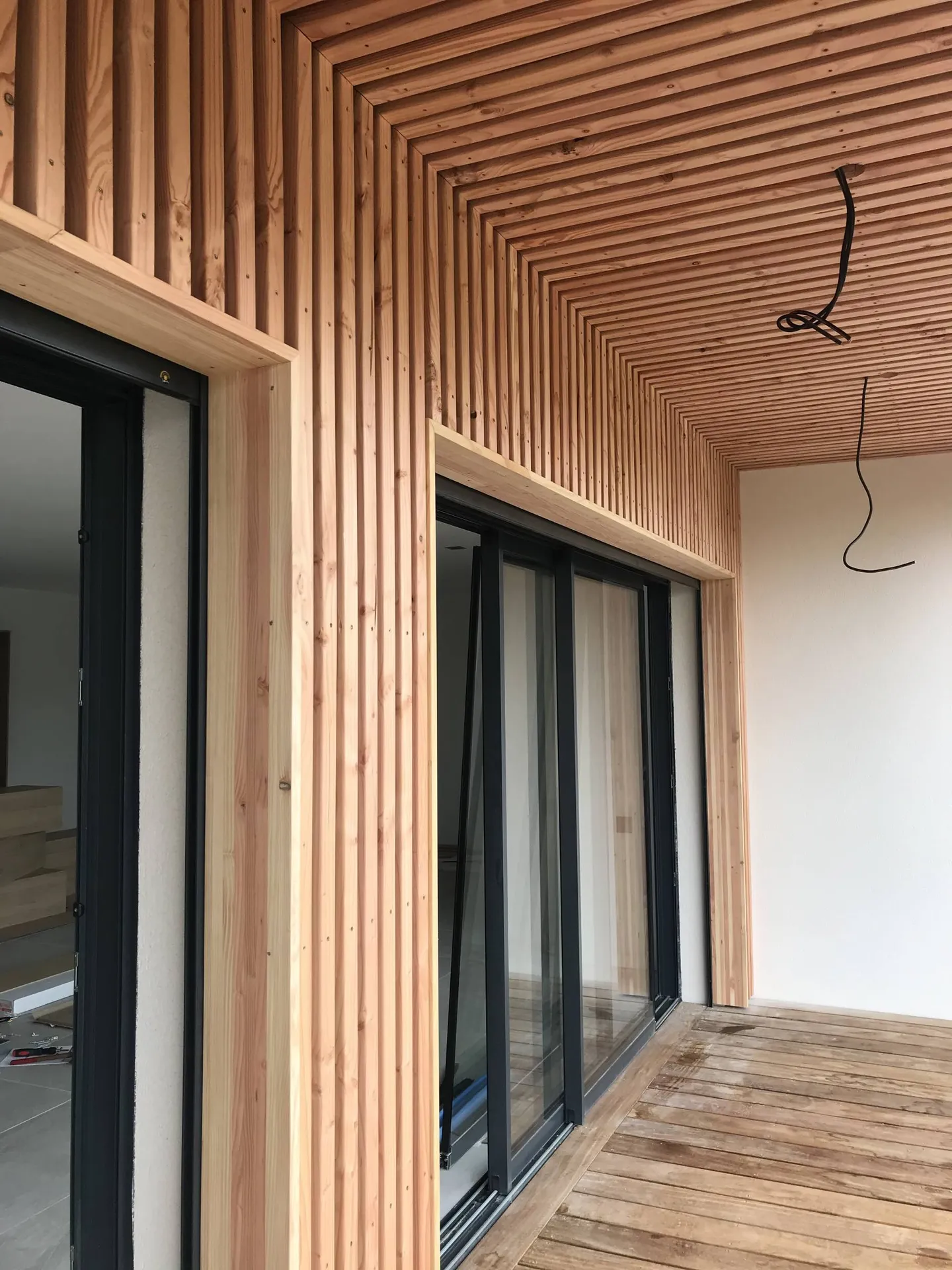 Nous avons choisi avec lui un bardage claire-voie en Pin de couleur claire pour allier au mieux avec ses goûts et sa maison.