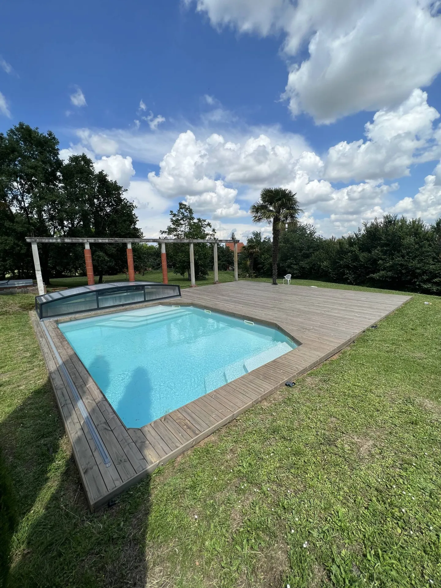Voici une rénovation de contour de piscine en lame de bois DOUGLAS biseauté imprégné gris sur la commune de CANTE.