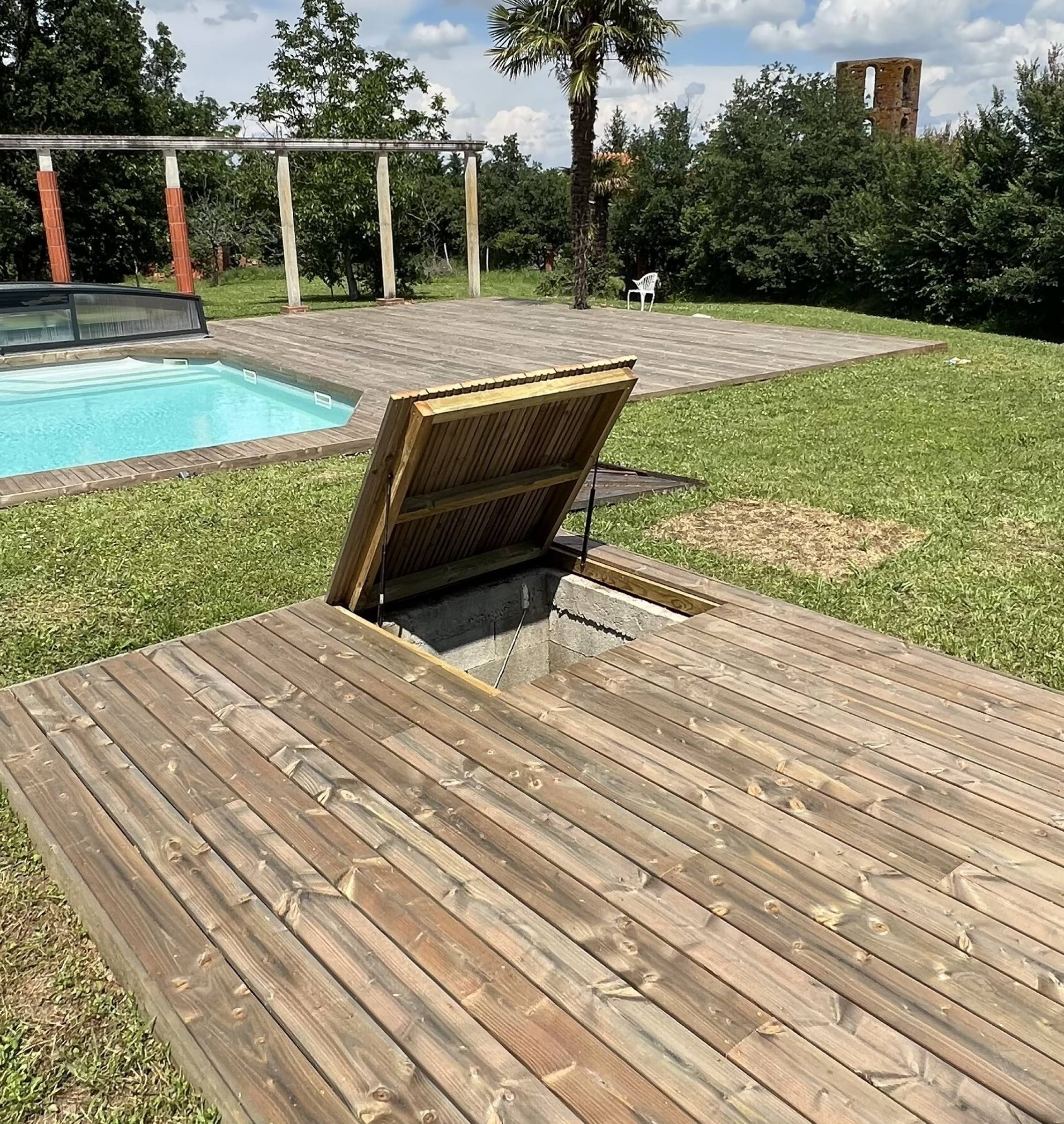 Nous avons réalisé la création d'une trappe amovible sur verrin à gaz pour l'accès au moteur de la piscine. Le choix du verrin à gaz permet la stabilité du bois qui constitue cette trappe.